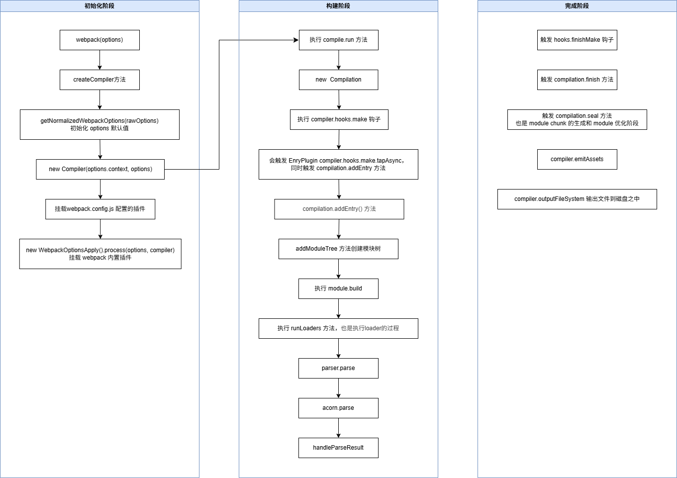 Webpack 打包流程包含三个阶段: